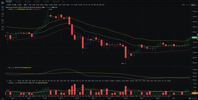 BTC行情分析:4小时图上看,布林带保持向内收口;币价在布林带中轨与短期均线上方,上方9200压力位被刺破,目前压力位在MA60均线9300位,下方支撑位9130,强支撑9100位。附图指标中KDJ指标在50值上方交叉运行,MACD方面红色能量放量趋势,快慢线平行向0轴上方运行趋势,STOCH呈金叉缓慢向上在50水平线上方,RSI勾头也是微微上行。小时图上看,行情向上试探突破上轨阻力位置后,市场情绪有所回暖,但BTC短时行情还会保持区间震荡,操作上建议高抛低吸为主。