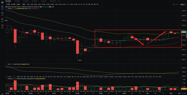 行情分析:日线图来看,布林轨道开口水平运行,币价运行在布林中下轨区域,插针向上试探受阻于中轨一线附近的阻力有所回调,目前在9230一线震荡,运行在MA5均线上方波动,MA5均线与MA10均线粘合下行,在币价下方形成短期的一线支撑,其各均线平行在币价上方形成压制。目前小时级别的震荡被向上突破,价格进入底部上升通道运行,日线昨日以下影光头小阳线报收,技术面有进一步反弹考验日线中轨阻力9350的需求,但一定会再次受空头抛压的打击,预计今日仍将以上升通道为依据展开震荡。