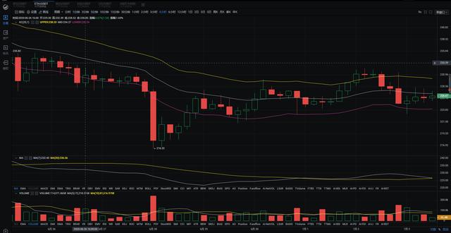 ETH:最近以太坊跟随比特币行情运行,一直处于低位盘整期,但是随着前两天的震荡上行,以太坊好不容易上涨到了231一线附近,但是昨天晚间的一波下跌,直接回到了解放前;四小时图来看价格抵触到布林带下轨未能突破,底部支撑强烈有反弹迹象,MACD多头缓慢拉升,快慢线粘合运行,KDJ三线张口发散。小时图来看布林带渐渐缩口,凌晨多次刺破布林带中轨,指标MACD空头能量无力,快慢线水平直行,KDJ三线拐头即将粘合,综上所述,凯哥建议高抛低吸。