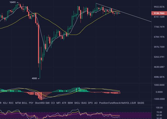 日线图上看,1D 2D 方面还是持续看空,上方压制位在9400附近,虽说凌晨价格有所上涨,但是依旧没有打破上方的压制位,行情依旧处于弱势空头状态,日内交易的朋友,还是建议以9400位压制位,做空为主。