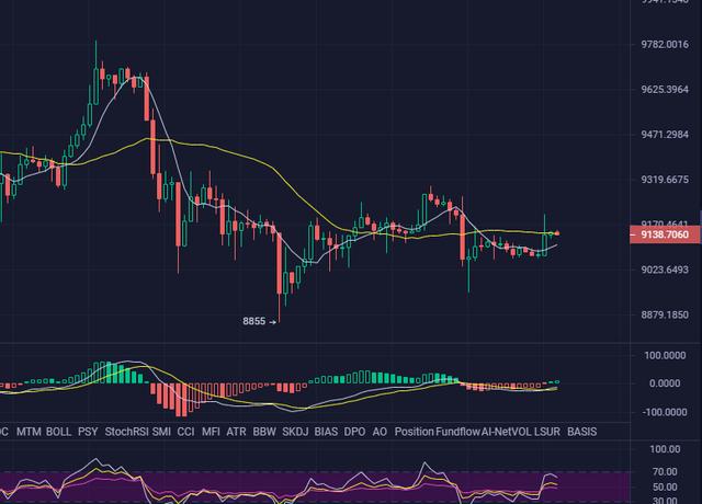 结合日线和四小时的走势来看,比特币整体的走势目前还是一个震荡姿态,价格并未从区间内走出,上方压制9200较强,所以操作建议区间内高空低多即可。