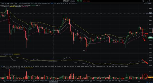行情分析:日线上来zhen看,昨天一根大阴线收尾,日线上短期上方承压受阻于9500整数关口阻力压制承压下行风险。昨日最低跌至下方低点9160后,短期来看多头上涨动力不足回落下行,日线上布林带张口下行。4小时图上看,一根大阴线使比特币价格回落大布林带中下轨运行,受60日均线支撑。MACD快慢线在零轴上方交死叉向下延伸,KDJ指标三线向下散发。五日均线在上方9200位置附近形成一线阻力,且在缓慢下行。若是后市没有出现较强反攻,一旦上方压制下移,那么价格再度下行将是大概率事件。