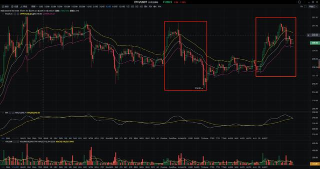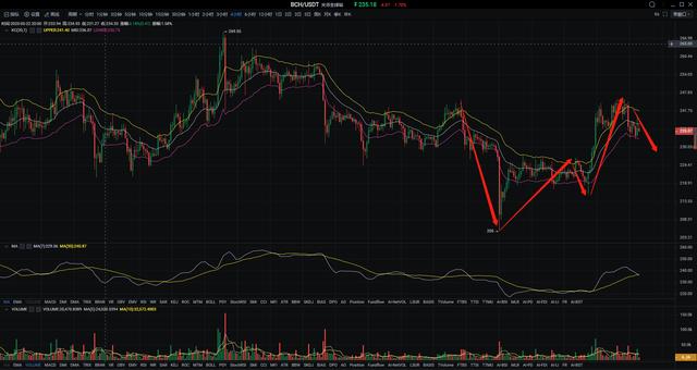 BCH:今日三大主流币中表现最好的非太子莫属了,技术层面上一波上行,直走出近7个点,给出了足够的把握多单的时间和利润空间,然后在240附近徘徊了十来分钟还是没有继续突破。日线图中,太子价格运行于布林带中上轨之间,继昨日一波下行直探233,附图指标中,KDJ中KD二线已经从上到下和D线在高位粘合,有形成死叉的趋势,MACD多头的量能有些不足。小时图中在下午4点一波拉升后触及60日均线后回调,当前币价受布林带中轨以及5日10日均线牵制缩量运行中,布林带有向下收口趋势。指标上MACD双线在底部金叉后上扬,KDJ三线在50处向上发散,RSI在中枢位置运行。