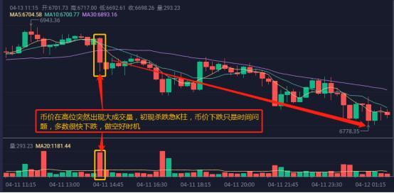 币价在高位突然出现大成交量,出现杀跌急K柱,币价下跌只是时间问题,多数很快下跌,做空好时机