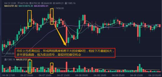 币价上升在高位后,形成两组高度相差不大的顶峰K柱,相应下方量能加大,多半资金跑路,视为卖出信号,较好的做空机会