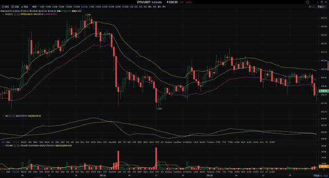 ETH:以太坊日线上来看肯定上方日线承压250阻力一路走跌下行,日线上以太坊联系几个交易日走跌中轨下方运行。4小看近期空头主力非常猛烈,布林通道整体开口呈下行趋势,多头非常无力,多次反弹均被压制,价格也是一直在下轨道内上下震荡波动,K线价格也是在下轨缓慢下移,技术上MACD死叉绿色能量不断放量,KDJ三线张口发散,有向下运行的迹象,空头趋势非常明显。