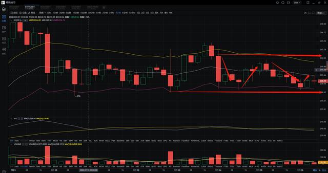 ETH:以太坊昨天至今震荡微跌,当前价格在239美元附近,24小时资金净流入1600万美金。技术面上看,正如昨天所说,ETH跟随盘面继续进行三角震荡,当前震荡区间越来越窄,从小时图上看,布林带张口向下运行,行情由中轨下方反弹至中轨上方。五日均线向上拐头上穿十日均线,附图MACD快慢线进场后运行在零轴下方。目前盘面来看上行例如偏弱,日内预计行情震荡为主,关注236-243,操作建议高空低多。