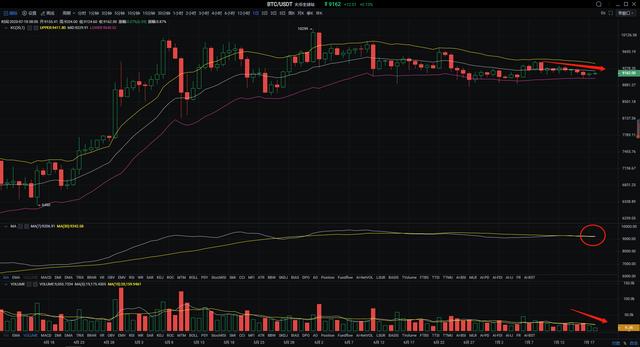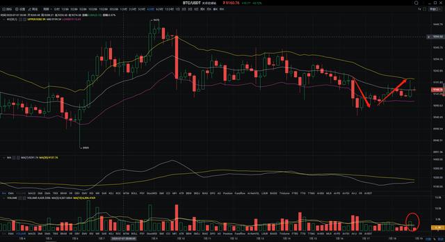 行情回顾:下午比特币一波回调最高到达9204美元,并未站稳9200位置,比特币行情依旧是在区间震荡之内运行,日内行情现在处于布林带中轨中下方受到中轨的压制,5、10、30日均线压制,短期形成冲高回落走势。