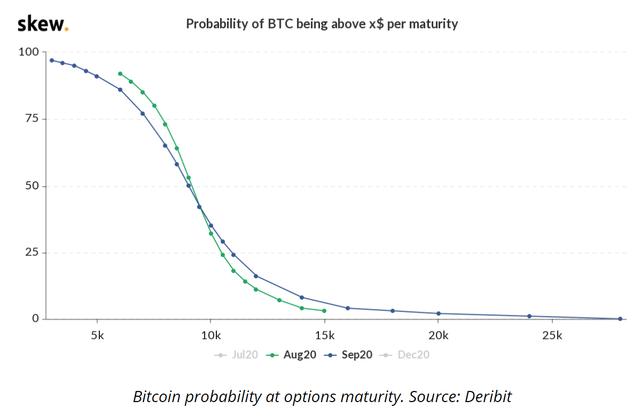 最活跃的期权行使日,是每个月的最后一个星期五。如前所述,这些数字似乎很保守。8月和9月的数据,都表明比特币价格将保持在9,000美元以上的可能性只有50%。50%的赔率实际上是中性的,因为数学模型指出,高于和低于该目标的赔率几乎相同。相比之下,7月到期(距离现在仅两周)8,500美元的可能性为76%。随着我们接近到期日,该模型变得更加自信。