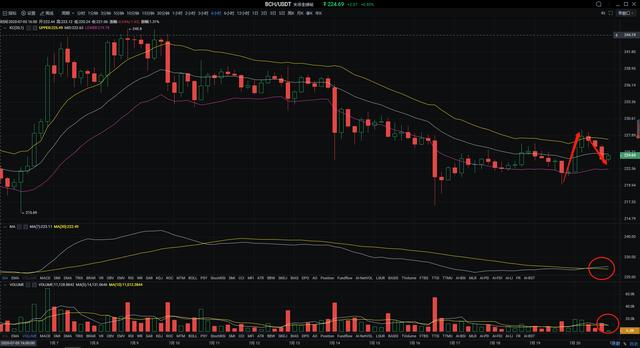 BCH:太子白盘至今震荡下行,当前价格在223美元附近,24小时资金净流入1500万美元。技术面上,日线来看,BCH已经在200-270美元的横向区间徘徊有近半年之久,而K线有形成弧底的迹象,2个滞跌的趋势表明BCH不久有机会酝酿一个日线级别的大突破行情。4小时级别价格在10日均线上方运行,价格所处位置以及形态也不是特别适合做空,这里震荡的时间足够长是一定会成为震荡底部的,后续也没有利空。