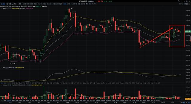 ETH:以太坊早间价格上行受阻240位置附近之后,小幅回落行情也是进入横盘节奏。目前多次向上试探未能打破240位置,由此可见此区域阻力强劲,日线上连续四个交易日小幅震荡维持235附近,日线上以太坊获得230支撑反弹上行至240一线运行。小时线晚间操作上肯定关注240整数关口阻力压制,突破240阻力压制以太继续追多看涨。反之行情空单在回落至238下方空单买入,下方空单关注中轨236支撑。
