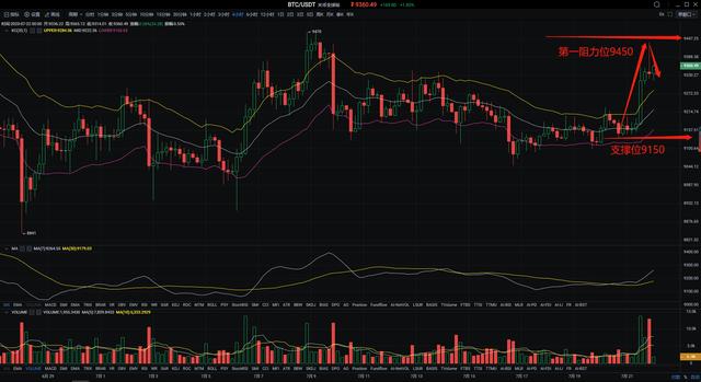 行情分析:在经历了长时间的窄幅震荡后,今天比特币终于放量拉升,主流币呈现普涨的局面。日线形成一根大阳线,价格穿过60日均线,前面比特有相当长一段时间收到MA60的压制,目前行情处于布林上轨一线运行,短期压力位关注9450-9500一线。四小时图看,震荡多日的行情从下午至晚间强势拉升300个点左右,使目前的局势发生改变,币价在9360附近震荡修复,斐波那契回调线数据显示9150日内低点,上方关注9450位,附图指标中KDJ三线向超买区运行,MACD方面多头能量放量两线向零轴上方移动。整体来看操作高空低多为主。