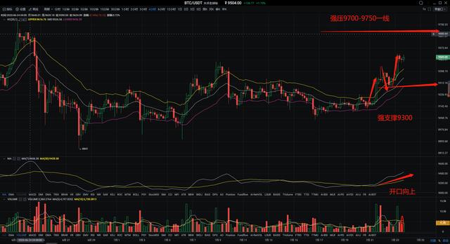 行情分析:从日线上看,比特他昨日照常还是以大阳收尾,K线早间一路向上持续攀升至9530美元,当前K线形阴柱下影线,这里很明显的能看出布林带缩口持续扩大,表明了小幅度回撤趋势较为明显小时级别图来看,布林带向上开口运行,比特币价格在上轨遭遇压力后开始缓慢的走回踩,技术上MACD金叉多头,红色动能从放量到缩量来回变换,KDJ三线运行于日间行情预超买区,短期行情预计会先震荡蓄力,晚间再次冲高,操作上建议回踩后进多。