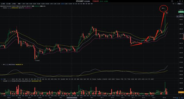 ETH:以太坊今日可谓是望而生畏,领先带中整体大盘持续一路向上狂飙,多头量能依旧是强硬的不容置疑,午间短时回踩259附近后迅速反弹,目前在264附近震荡盘整。日线上来看,K线连续两次大阳收尾,昨日走势持续上攻趋势,今日早间走势依旧如此,KDJ指标上金叉形态后开始逐步向上继续验证,则后续还会出现短暂的回撤行情,但不会回撤太多而后继续向上攀升,KDJ指标也出现短暂的持平趋势,操作上以回踩多单为主。