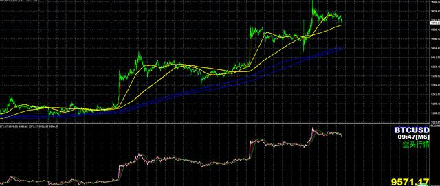 理由一:K线位于黄线价格9600-9550内运行,看震荡