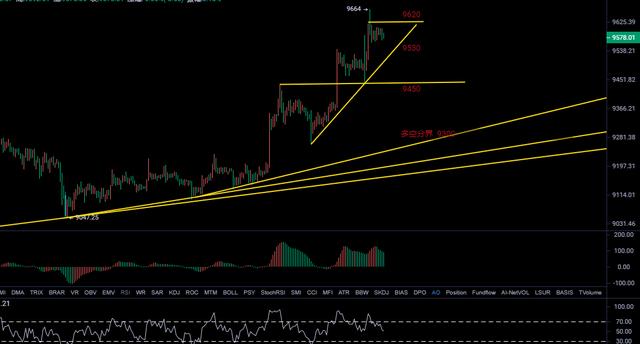 空头:可以依托短期压力点9620干空,止损放在昨天高点的9660上方,止盈看9450