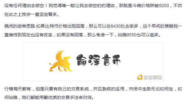 在昨天的文章<俞泽言币:7.23比特币震荡也改变不了我看多的决心 9750见>,很清楚的描述了晚间会出现回落,在9430附近去做多的思路,昨晚行情也确实先跌后拉升,在9440处开始反弹到9580,之后快速回落,这一波的操作快的让俞泽还是有点迷惑,不过还好之后依托9440支撑震荡向上运行,到达了9664一线。