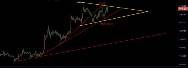 图中一小时,我们通过画线可以看出比特币在连续三波拉升之后,得到了三根轨道趋势线,在昨天的时候回落到了上轨和中轨之间运行,我们通过昨天的一个高点和今天高点结合加上底部支撑画线画出了一个三角区间,这个早上画的图,我们可以看到K线一直到我们的区间顶部运行,说明暂时多头还是比较强的。
