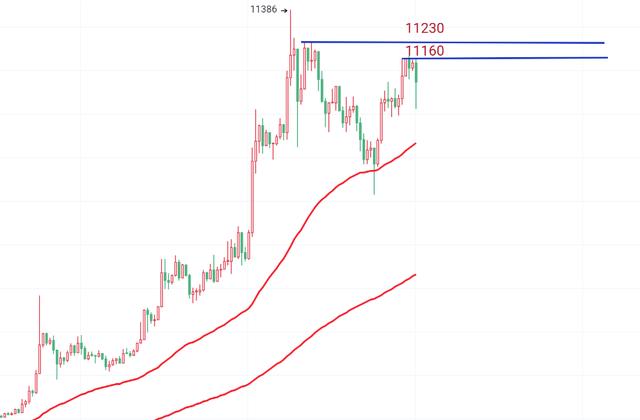 短线30分钟级别去分析,比特币在早间11230受到压制,继而开始回落(俞泽也是在朋友圈提示过),最低跌破了60日均线价格到达了10573,收线之后只是虚破,之后比特币开始反弹,再次受阻于11160,开始出现回落,我们重点关注比特币价格能否有效跌破10800,也就是下方60日均线支撑,如果跌破,那么比特币将进入整理期,短期内会在两根均线内运行。