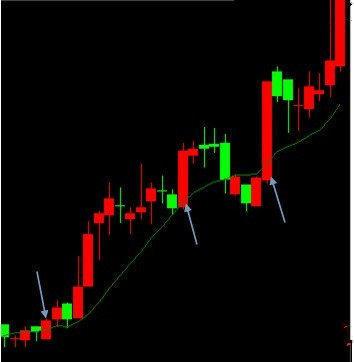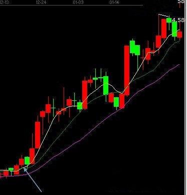 我们以10日均线为例,在k线图中,我们可以看到,在价格价格呈上升趋势时,均线对其形成支撑;当价格跌破均线时,对其形成阻力。当价格向上突破均线时,是一个买入信号,这时可以建仓买入,下图有三个买点(下图箭头指示处)。