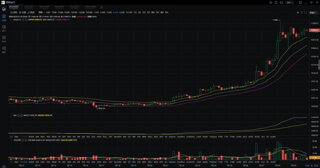 行情分析:日线持续放量走出了主升浪行情,不过昨天下午的一波回调幅度还是有点大,形态上也是收出一根长上影线,短线可确认10300美元上方受阻,MA均线持续抬高,接下来的行情大概率横盘等待资金分流,一旦出现急跌是可以抄一些优质的主流和山寨的,情绪仍然在高涨,等待行情的下一步推动,日内振幅过大。四小时级别图中,布林带收口,五日均线和十日均线粘合运行,币价在其附近多空胶着,有再次企稳其上方波动的趋势;后期若是可以突破并企稳11200位置,则行情会继续向上展开攻势,并想高点拉近;反之,会继续徘徊在五日均线附近震荡,以时间换取更多的量能。