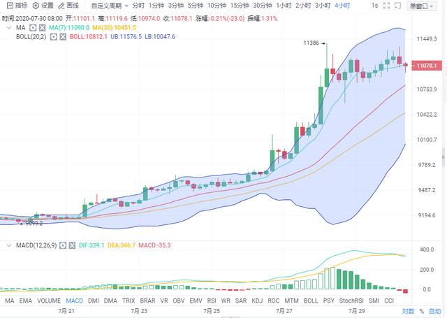 日线级别可以看出今早大饼尝试破新高,价格强势突破BOLL上轨,被强势拉回,目前价格都是一直处于中轨的位置,短期在上方回落是下不来的,预计需要等周期时间来进行盘整,日线MACD多头持续放量运行,KDJ目前三线聚拢走平移,RSI在70上方长期的话价格回落下方需要一段时间。短线操作即可。4小时k线价格即将触及BOLL中轨,MACD绿色动能持续等量运行,快慢线形成死叉后走下行路线,KDJ三线向下扩散,短暂11000附近是一段小支撑。