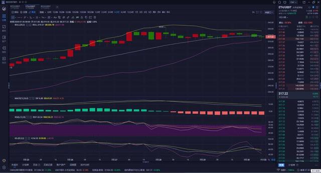 【子禹ETH行情分析】 四小时图来看,布林轨道缩口向内运行,币价的波动区间也随之变小,短期来看币价上行受阻于中轨一线的压制,运行在其下方震荡,插针向上试探有所回调,在317一线附近徘徊,运行在MA30均线上方,MA5均线下行即将与MA10.MA20均线粘合,在币价上方形成压制,附图指标来看,MACD快线下穿慢线在零轴上方开口向下移动,多头能量有所放量,RSI在合理区间调整,三线窄幅水平运行,KDJ.J线下穿K线D线形成死叉向下发散,日内操作上建议先看一波小反弹再空单入场。 【子禹操作建议】 318-320附近空单入场 止损323 目标315-312