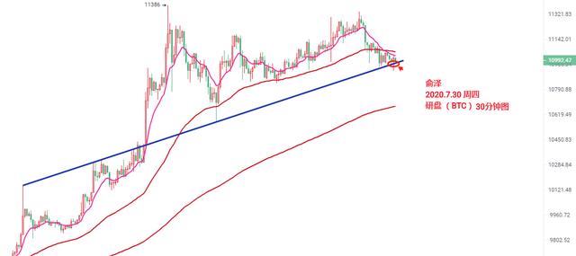 俞泽觉得比特币价格还能不能跌下去,就在于10960这个位置能不能有效破位,如果有效跌破那么接下来会概率会到4小时20均线支撑位10800价位。