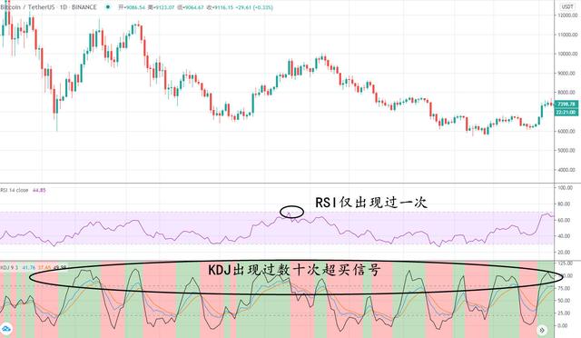 价格走到RSI超买区时,也会到KDJ超买区。这样失去了指标叠加的意义。(更多关于指标叠加的误区,可以看之前币逢源的文章讲解)