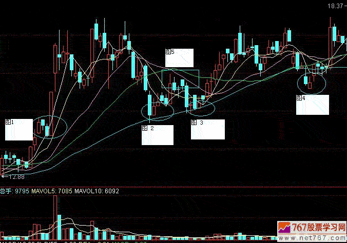 本图图1为上涨过程中一个平台,图2 为第1次回调到图1平台,图3为地二次确认回调有效,图4为重新确认上升通道下轨也就是图5顶部。