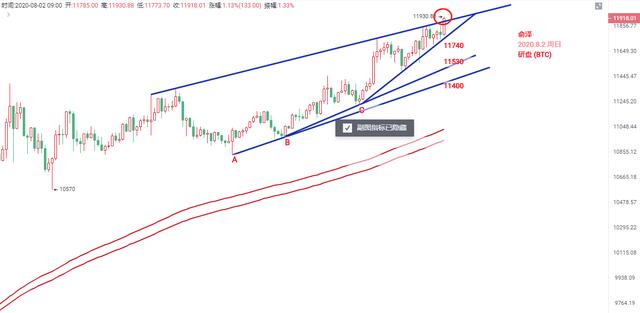 比特币在昨天的C点开始反弹,分别在上方压制线11750 和上方11850压制回落!然而回落力度并不是很大,8.2早上的一波行情拉升直接突破压制线11900压制,接下来看上方12020画线压制。