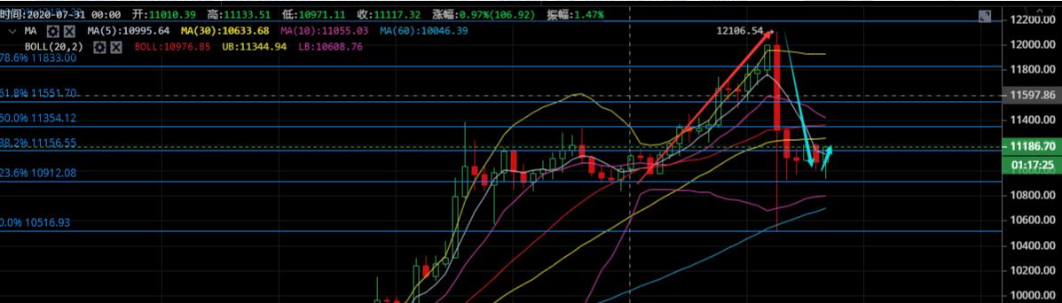 比特币日线来看,昨日收盘一根大阴线,最高12106.54高位,随后盘面出现不稳开始大幅度跌水,达到低点10500,跌幅1600点左右。目前布林带向上开口,K线运行布林带中轨上方11140位置,下方MA10均线形成支撑,上方11300阻力,若日内企稳上方11300位置上看11500位置,下方跌破10900顺势下看10500,日内苏苏建议各位币友稳健操作,看破位趋势。