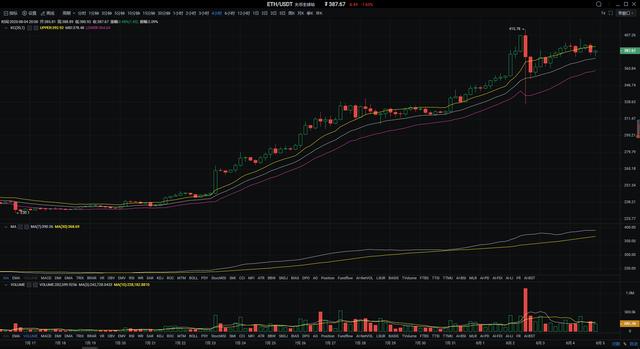 ETH:以太坊近期一直是引流市场的焦点,整个主板区能否持续性上涨关键在于以太坊。早间币价触及402.98高位回落,日内行情震荡偏下行,晚间最低点触及380附近,目前暂报387.88美元。从主力一贯交易风格来分析,利好出尽便是利空,在当前持续企高的以太坊手续费矿工收入也创出了历史性新高,可以说晚间行情至关重要,在持续炒作了数月的以太坊能够在今晚启动测试从而终止本轮反弹,我觉得概率挺大。目前四小时图中,上方压制位看400,下方支撑位为先看四小时图中MA10日均线380,其次是布林带中轨375附近。