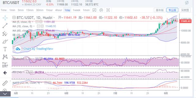 四小时图上看,布林带呈收口姿态,K线连续走阴之后,比特币价格是已经跌落至布林带中下轨区域。上方五日均线下行于中轨线贴合在11612位置,后续价格若能突破,预计会刷新日内高点走出一波上行。