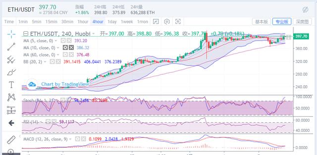 以太坊(ETH)经过昨日午后的一波上行,价格是再度回到390位置附近运行。日内早间价格走出一波上行,高点上移至398上方区域,目前价格小幅回调在397位置附近运行,短期还有上行的可能。后续重点关注400压制位置,价格一旦突破企稳,有进一步上行的可能。目前整体的的走势是一个上行姿态,所以操作上建议多单为主,空单为辅,上方阻力关注406,下方支撑关注388-390