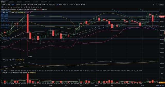 行情分析:比特币今早多头再次发力,期间直接强势拉升,最高点触及12052位置,未能突破前期高点承压回落后开始突然暴跌500点,受阻于黄金分割0.618一线。本次上涨再次试探上方12000附近的压制位,不过并没与完全的企稳在12000上方,而且K线再次运行在布林上轨下方,这是布林带即将缩口的迹象,并且小时图附图指标RSI运行在超买区,MACD开始拐头,一旦形成死叉就会再次回落,从这些指标来看的话短期是有回落的行情的,短期上方关注12000附近和前期高点12150附近的压制位,防守压制关注12300附近,下方暂时关注小时图MA10均线11850-11800附近的支撑位,防守支撑关注布林中轨和MA60均线11700-11750附近,操作上建议先围绕11700-12300这个大区间操作,破位再顺势操作即可。