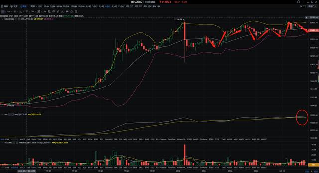 行情分析:日线图上看,币价目前在布林带中轨下方运行,布林呈现缩口姿态,现在币价已经突破布林带中轨支撑。MACD形成死叉连亘在零轴下方运行,KDJ三线形成死叉向下发散。MA5均线与MA10死叉后朝下运行,MA30线处于币价上方形成阻力。目前大周期处于空头结构,小周期5分钟线15分钟线有底背离形态,行情有反抽需求,目标位11800附近,由于短线行情风险信号较强现货上防控风险为主,技术支撑11500附近,11350,压力位11900,12100附近。