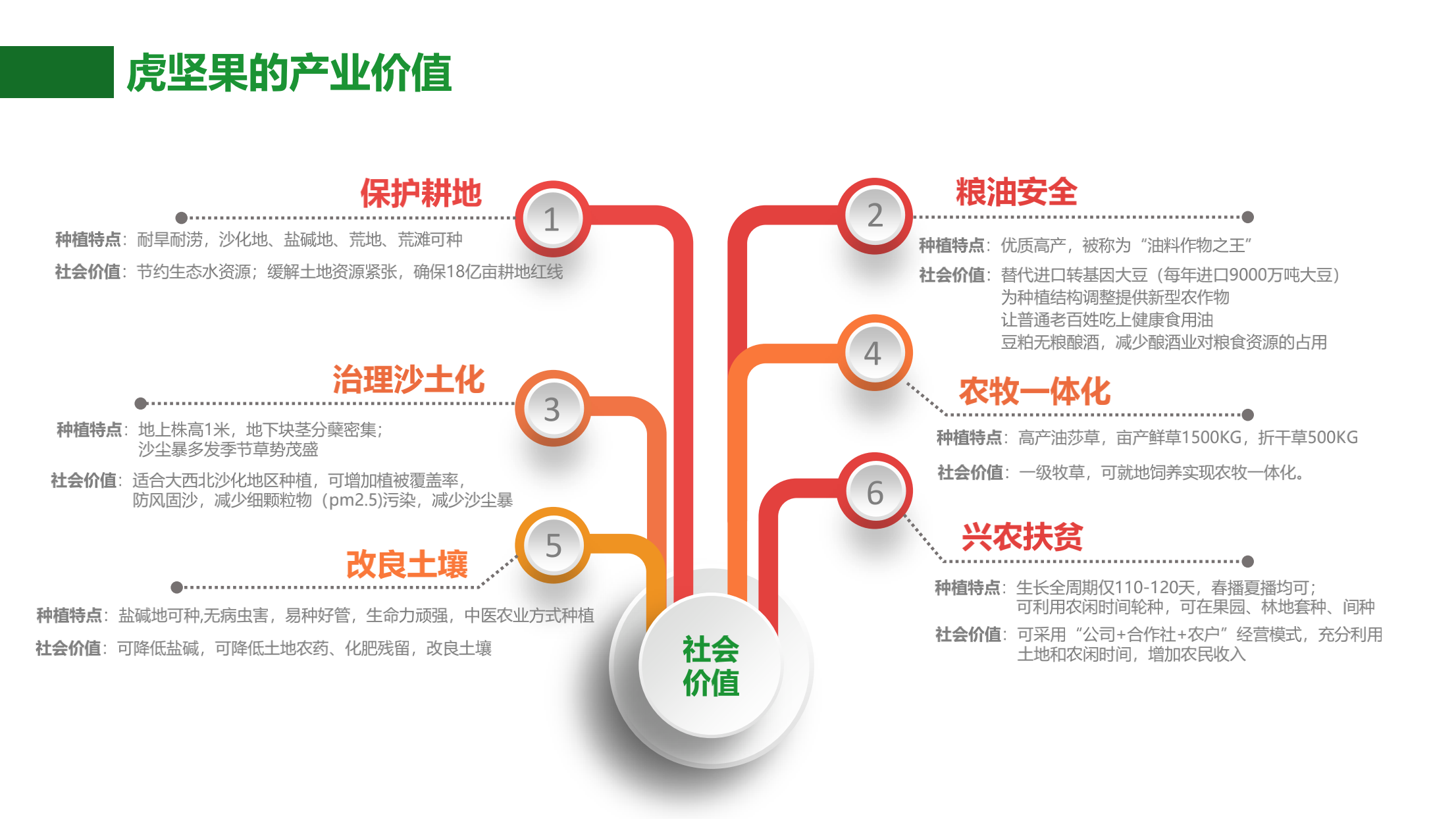 2016年4月28日,农业部发布《全国种植业结构调整规划(2016-2020年)》,指出“多油并举,因地制宜发展耐旱耐盐碱耐贫瘠的油料作物,在适宜地区示范推广油莎豆(虎坚果),增加新油源。发展虎坚果产业有助于我国种植结构调整,治理沙化土地,保护耕地,兴农扶贫,解决粮油安全问题等,具有极高的产业价值。