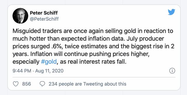 “受到误导的交易者再次对黄金进行抛售,以应对比预期高得多的通胀数据。 7月生产者价格飙升0.6%,为预期的两倍,为两年来最大涨幅。 随着实际利率的下降,通货膨胀将继续推高价格,尤其是黄金。”但是,尽管像彼得·希夫(Peter Schiff)这样的黄金支持者发表支持评论以此试图让投资者安心,但走势图表却描绘出另一幅图画。