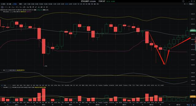 ETH:以太坊经过昨晚领涨趋势,现已稳定390上方一线位置,目前币价在392附近运行。4小时图来看,布林带呈现平行微微向上运行的状态,目前价格处于布林带中轨上方,MACD快慢线呈现缓慢向上运行,底部有支撑形成迹象。RSI和随机指数走平,有小幅上行趋势。,KDJ拐头向上发散,虽然整体技术面有利多头,但是日内有机会回调,可低位把握机会入场多单,当然,如果行情走至上方关键支撑位附近,也是可以考虑空单入场的。