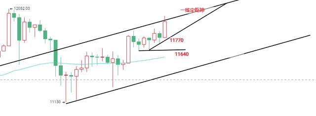 多头方面:我建议早上等回落到11770附近直接做多,止损40个点,目标看11900-12250