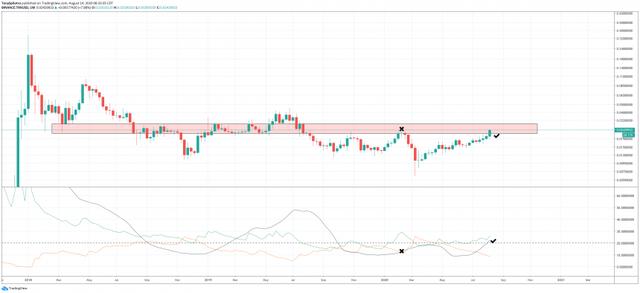 黑色线代表ADX本身,突破20的关键水平并准备上升。正如上升趋势正在加速发展一样,高时间框架阻力正在渗透,这表明阻力将很快打破,而Tron将推动更高。