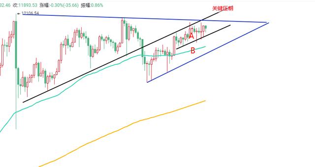 上升通道 目前我把他分为AB两个部分 ,A部分是上升通道的上轨 ,A部分的区间为11260-11800,而这两天的比特币的活动范围也一直在这个A部分区间活动,如果有破跌破中轨11800,那么就是进入了上升通道的下轨B部分 ,B部分的通道为11800-11560,11560也是三角形态和下轨的支撑双向支撑,那么在这个底部11560去做多,我觉得是最合适的。
