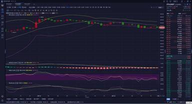 从小时图来看,布林轨道开口向下运行姿态,早间币价大幅回踩插针至422一线,触底后迅速反弹,冲高后币价再次回踩寻求支撑,在426一线获得支撑后,多头开始发力,币价成功站上了布林下轨上方,K线上连续三连阳,重心逐步上移,币价多次插针向上冲击,遇阻有所回调,目前运行在布林中下轨区间震荡,徘徊在427一线附近波动,运行在MA5均线上方,MA5均线交叉MA10均线下行,在币价下方形成一线支撑,其各均线在币价上方向下运行形成压制,附图指标中,MACD快慢线在零轴附近开口平行,多头能量有所缩量,RSI运行在合理区间调整,有所下移,KDJ运行在高位即将聚合,J线拐头下行,有形成死叉向下发散的迹象。目前的走势来看,行情偏震荡下行,那么操作上建议不要盲目追多,反弹看空为主。