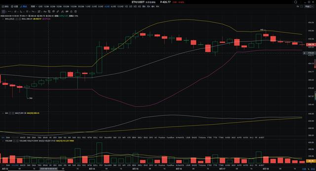ETH:以太坊在昨晚跟随大饼向上发力,在刷新新高至445后回撤,今日价格一直趋于430上下震荡。四小时方面布林带依旧是个走平状态,币价位于中轨附近震荡,短期均线粘合走平,行情存在着强烈的调整需求,短线上有再次下行的可能。所以在目前的交易过程中建议大家适当的保持多头情绪,而后等待KDJ进一步的转头后稳定的等待行情拉升即可。