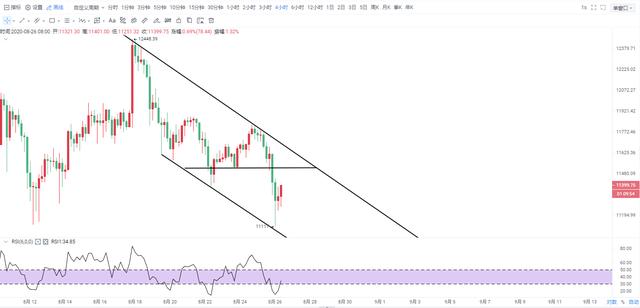 昨天的比特币在跌到四小时的下行趋势线11100之后,开始反弹!整体跌幅达到了700个点,在如此强势的跌幅状态下,比特币的能量已经衰竭!再次下次则需要时间的积累,那么日间能出现反弹也是在意料之中,今天最重要的上方主要关注关注两个点:一个是一小时的的20均线压制11400附近的压制,另一个就是4小时的重要压制点11500附近的压制。