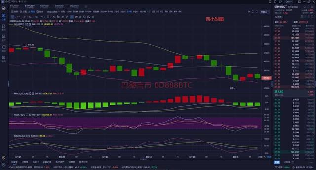 从四小时图来看,以太凌晨在370一线触底反弹,行情开始企稳币价一路震荡上行,多次向上冲击,未能突破上方388一线阻力,遇压后币价开始震荡调整,由于多头动能不足币价未能进一步上行,再次向下回踩,由此可见上方压制较强,目前币价运行在381一线附近波动,技术上布林轨道开口姿态,下轨微下行,MA5均线下穿各均线运行在币价附近,其各均线交叉粘合在币价上方形成压制,MACD空头有所放量,快慢线运行在零轴下方,RSI向下移动,KDJ运行在低位调整,三线窄幅平行,整体来看,短期行情走震荡,偏向于空头趋势,操作上建议反弹看空为主。