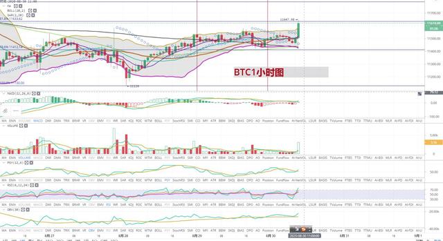 BTC行情分析:今天是周末,周线上目前还是空头占优。日线上,行情处于横盘状态,布林带在逐渐收口,需要警惕变盘风险。在小时线上,今日早间还是延续昨天的区间震荡走势,但是已经多次逼近到11600一线了,就在刚才主力资金进入直接拉升到11600一线上方。坚持高抛低吸即可。