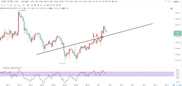 昨天的行情最高上涨到12050关口,之后出现回落,早间行情行情偏空运行,小时图RSI指标已经下穿50水平线,看空状态!早间主要关注上方11950的压制情况 以及下方11760的支撑,从8月初以来这已经不知道是第几次试探12000关口了,总之事不过三!这次破新高应该是大概率的事了,这几天被空头思路所误导,总担心会有一波插针,但是并没有给这个机会。