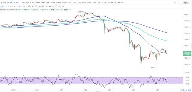 比特币在9.4号晚上22点左右来了波洗盘行情,值得庆幸的是最终收了个双针探底形态,这一波操作让比特币的走势稍微有了那么一点明朗的感觉了,起码在短时间内知道了9900附近是个底部支撑,那么接下来我们要关注的就是上方10600的压制情况和突破情况了,如果今天仍然无法上破10600,那么接下来的行情可以要在10550-9900之间盘整走一个震荡的局面了,如果站稳了10600,那么上方的10800和11100可能就是比特币在接下来要去测试的点了。